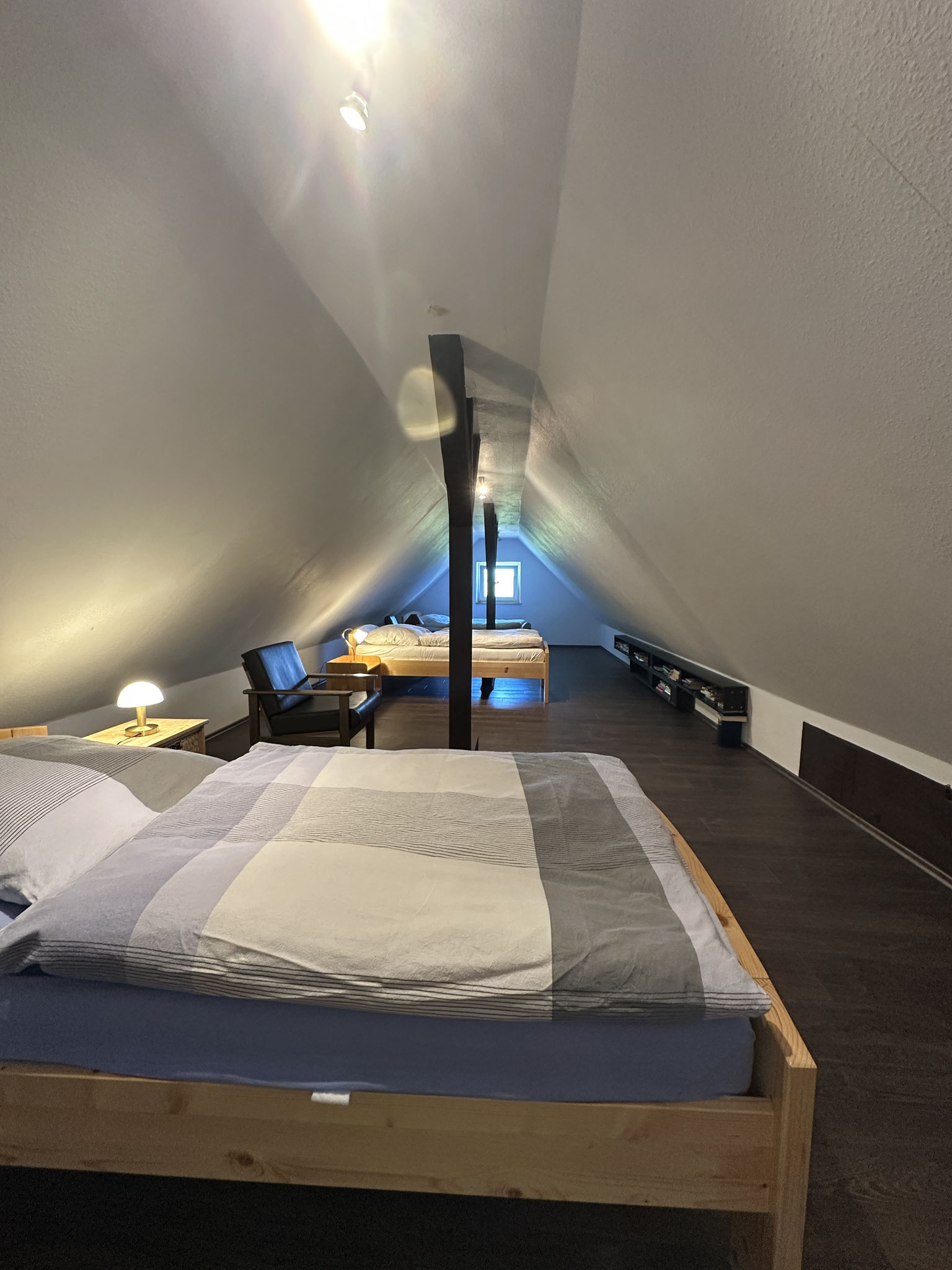 Die Wohnung besteht aus zwei Etagen; der Eingang liegt in der ersten Etage. Die zweite Etage, die über eine Treppe vom Wohnzimmer aus erreicht werden kann, ist das ausgebaute Dachgeschoss (Spitzboden).
