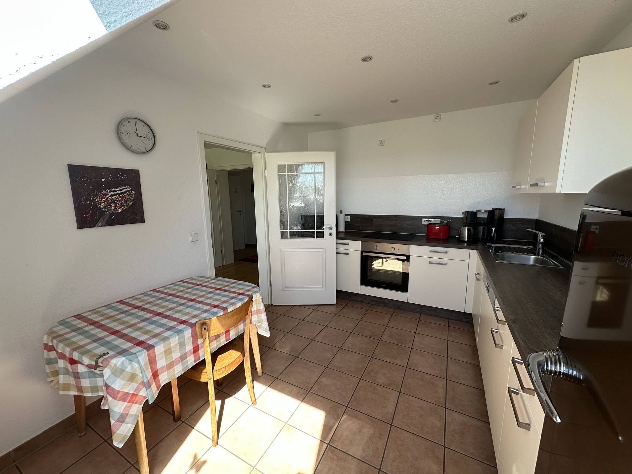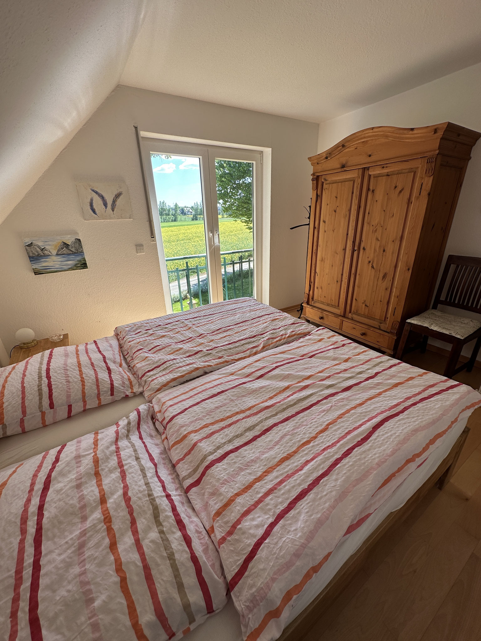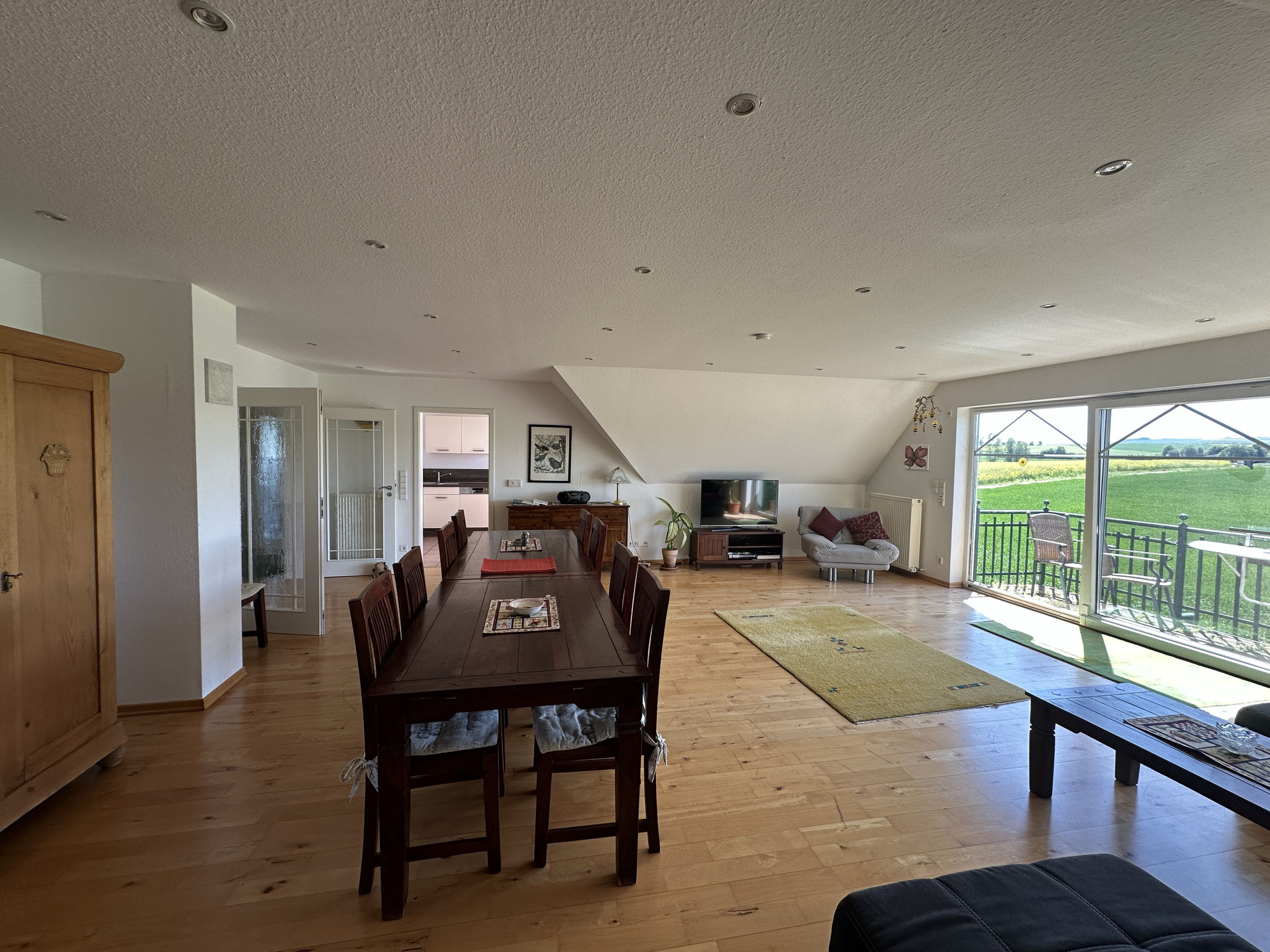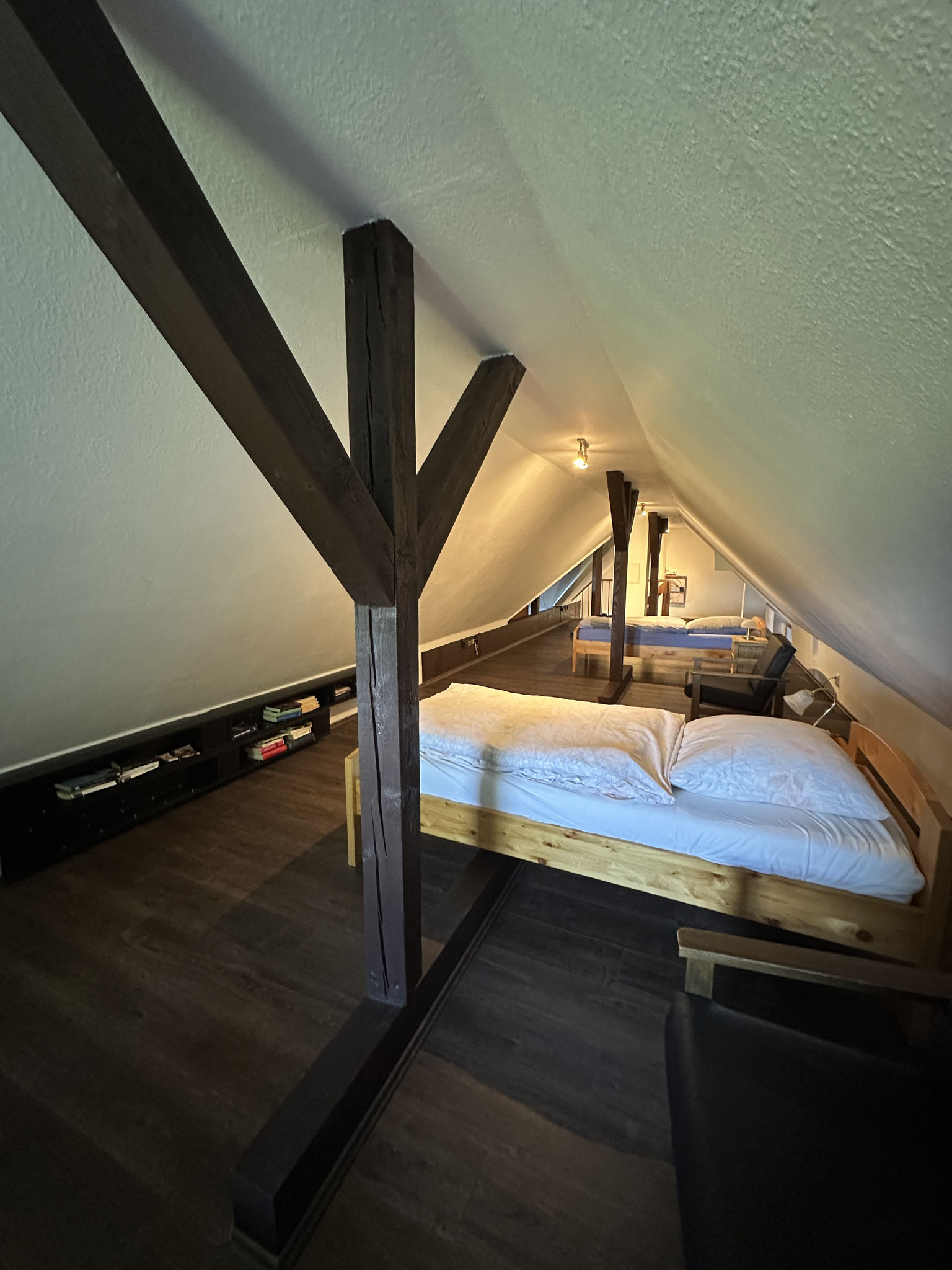 Auf der ersten Etage, die gut 120qm groß ist, befinden sich zwei (Doppel-)Schlafzimmer, Küche, Tageslichtbad, Gäste WC, Abstellraum (mit Waschmaschine und Trockner) und ein ca.50qm großes Wohn-Eßzimmer (mit Schlafcouch). Das Dachgeschoß ist wohnlich ausgebaut. Dort stehen vier Einzelbetten, eins davon in einer Nische.